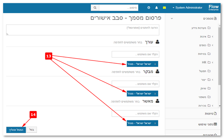 הערה: השמות בשדות נשלפים מרשימת העובדים באירגון שלך, באמצעות סינכרון מערכת FLOW מול מערכות מידע בארגונך. כמנהל מערכת, יש ביכולתך למנות עורכים.